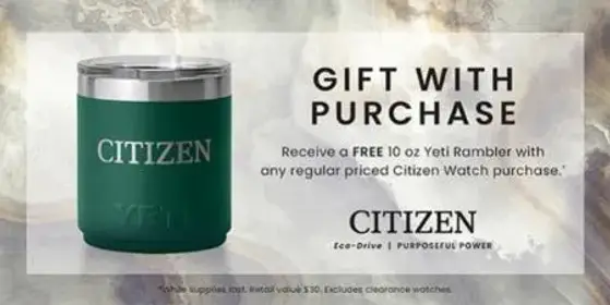 Don't miss out! Shop in store and receive a free 10 oz Yeti Rambler with any regular priced Citizen Watch purchase.