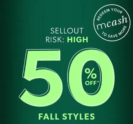 Going fast! Shop in store and get 50% off fall styles.
