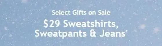 Hurry in and save! Shop in store and get our sweatshirts, sweatpants & jeans at $29.